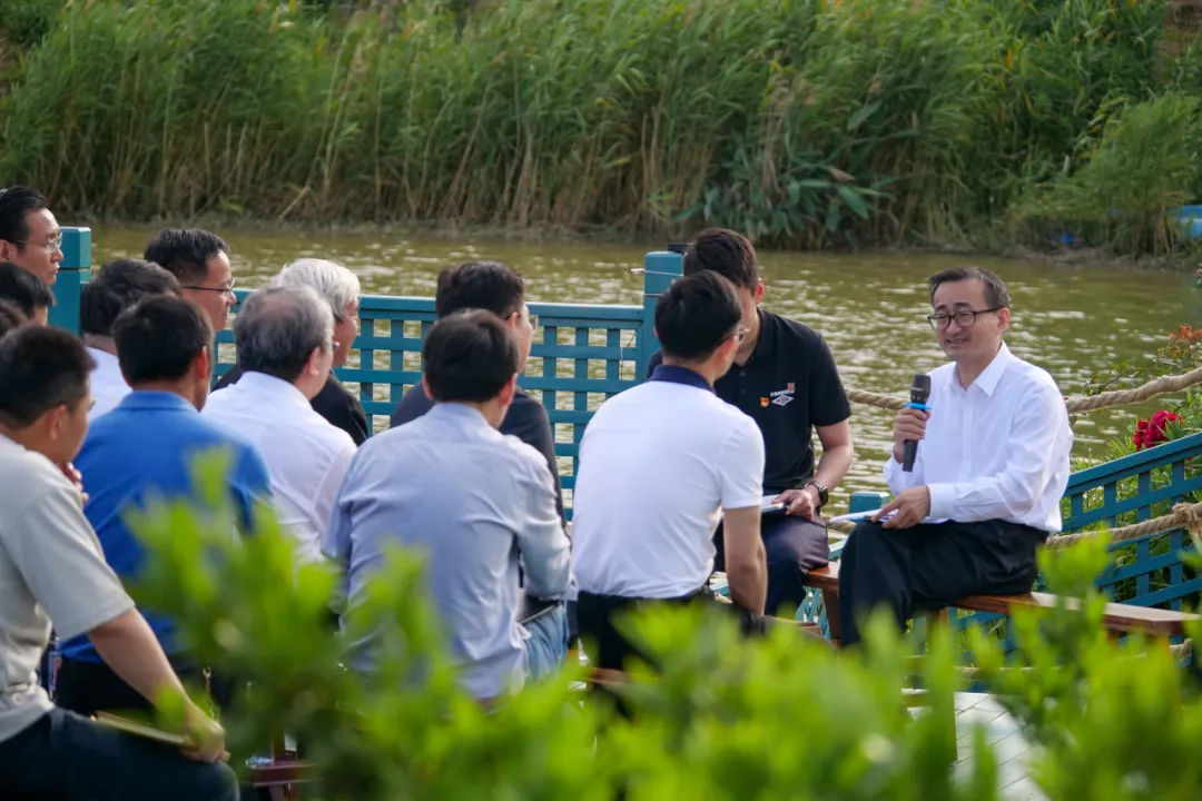 学习会后,刘元春校长一行随即来到南桥镇华严村橘米公社开展奉贤讲习所基层宣讲活动。南桥镇华严村党总支书记苑晨主持活动并简要介绍了该村基本情况,尤其是集体经济发展情况。刘元春校长与村干部、村民们围坐在河岸边,他谈到,奉贤讲习所深入基层,走入田间地头,在宣讲层面上既要“往前走一步”,让百姓看到政策走向和发展趋势,也要“向后走一步”,让村镇了解政策制定的现实原因和理论来源,使习近平经济思想真正入脑入心。活动中,刘元春校长还就大家提出的关于驻村企业服务农村经济、提升乡村品牌价值、改善农业基础设施建设、提高农业固定资产投资帮扶等问题进行了互动交流。奉贤区委宣传部、南桥镇党委、农业农村办、农业中心、各行政村、企业、农业专业合作社、乡贤代表等40多人参加了活动。