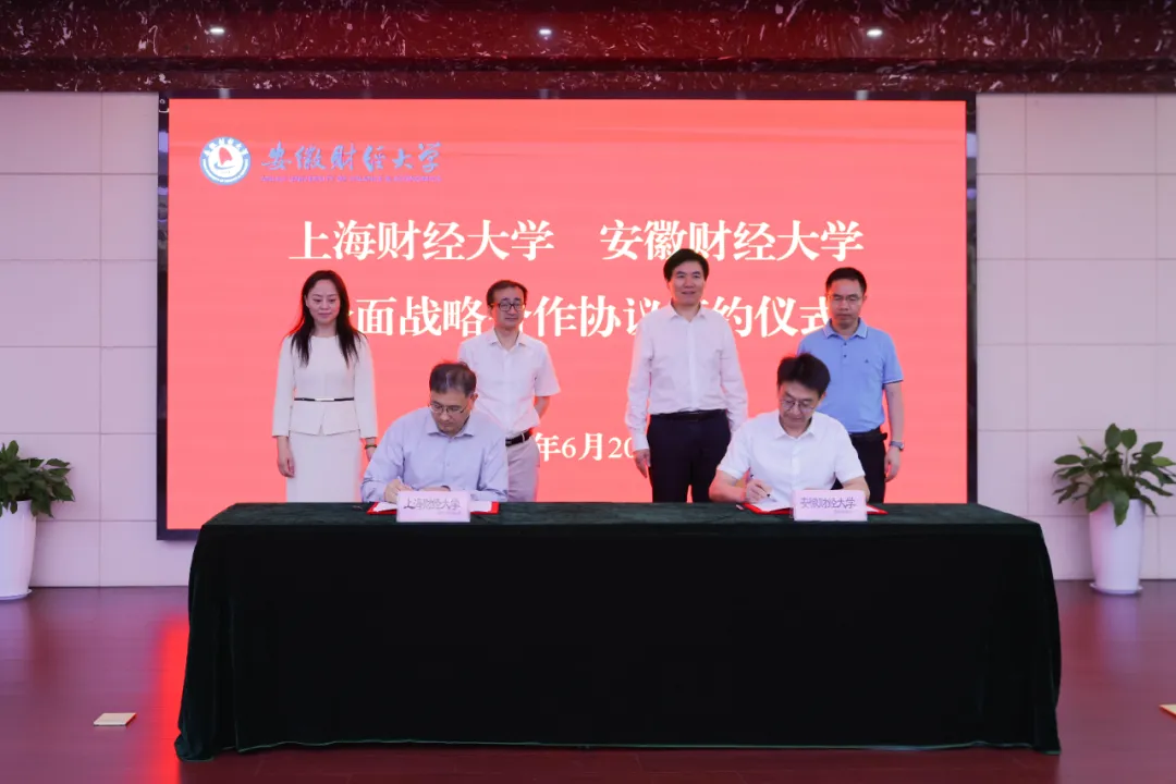 2024年6月20日,我校与安徽财经大学全面战略合作协议签约仪式在皖举行。上海财经大学校长刘元春出席并讲话,安徽财经大学党委书记虞宝桃出席并致辞,校长朱红军主持签约仪式,上海财经大学副校长李增泉、刘莉亚,安徽财经大学党委副书记张亚新,党委常委、纪委书记、监察专员武刚,副校长宋马林、王兵出席活动。