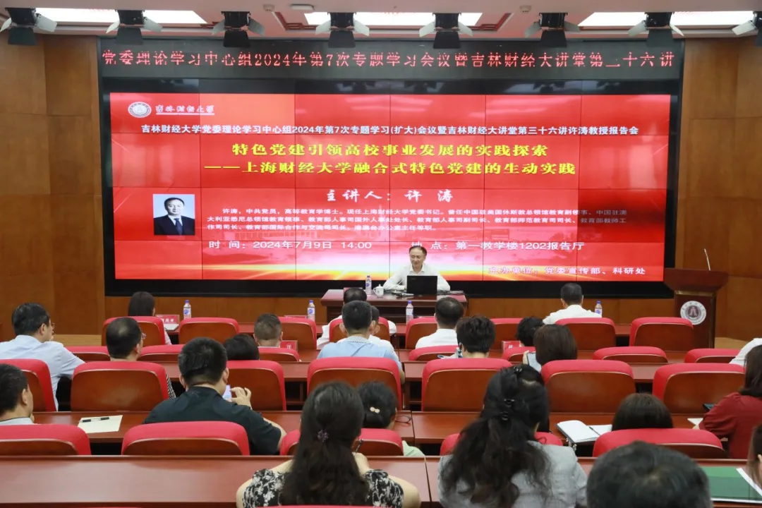 见面会之前,许涛书记为吉林财经大学党委理论学习中心组2024年第7次专题学习扩大会议暨吉林财经大讲堂第36讲作了题为《特色党建引领高校事业发展的实践探索——上海财经大学融合式特色党建的生动实践》的主题报告。