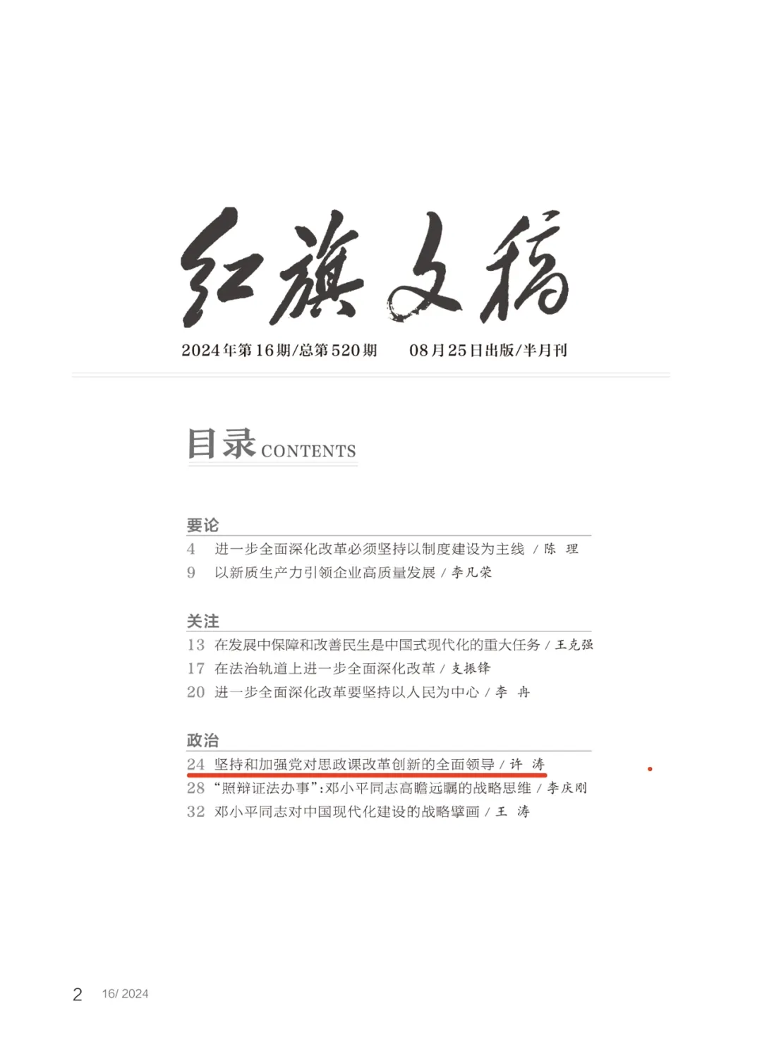 日前,上海财经大学党委书记许涛在《红旗文稿》2024年第16期发表了题为《坚持和加强党对思政课改革创新的全面领导》的文章。