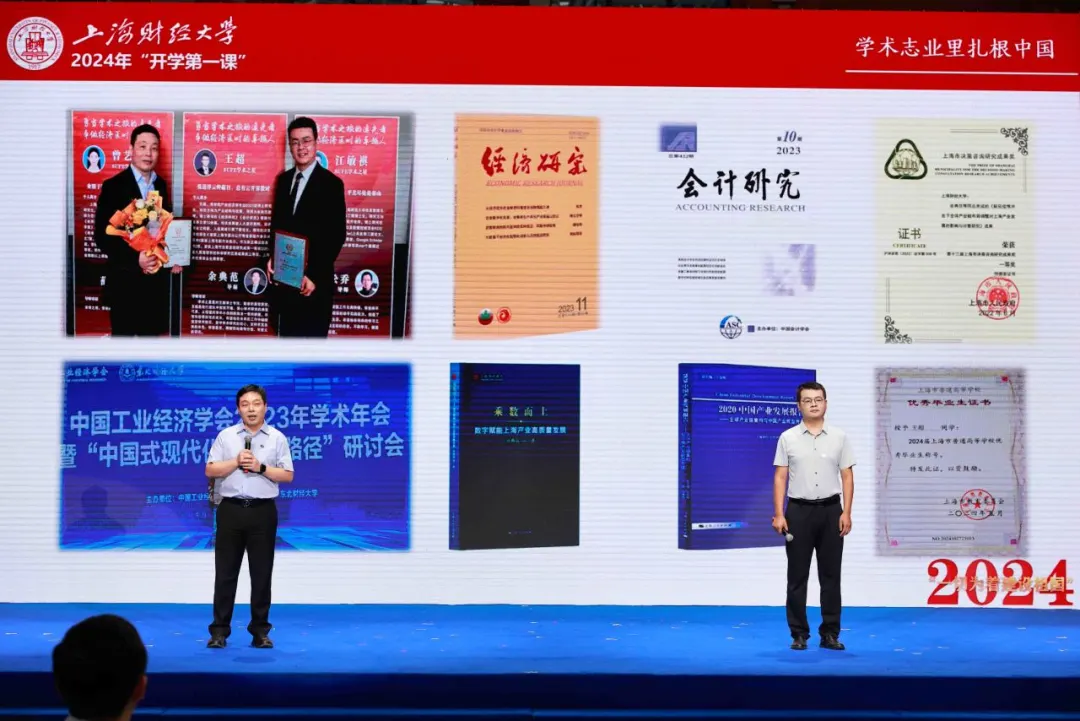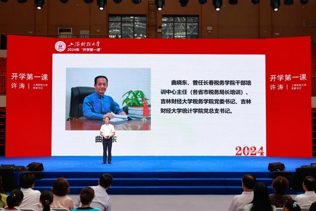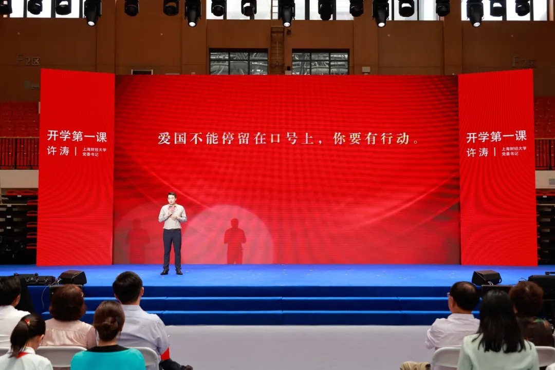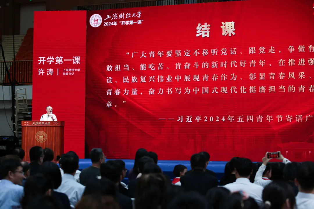 9月8日,上海财经大学2024级新生共同聆听书记第一堂思政课。课程主题为“一切为着建设祖国”,由上海财经大学党委书记许涛和师生代表、校友嘉宾及校外嘉宾共同讲述。课程共分为“前辈足迹共踏寻”“爱国情怀意正浓”“青春报国正当时”三个篇章,结合情景讲述、舞台剧、思政微课等生动形式呈现了上海财经大学“一切为着建设祖国”的光荣传统和新时代上财人矢志报国的坚守与担当。