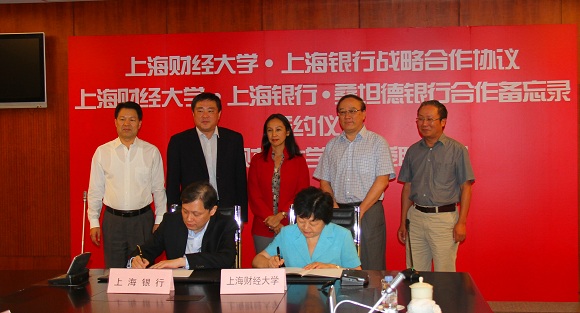 2014年8月7日下午,上海财经大学与上海银行战略合作签约暨校董聘任仪式在浦东上海银行总部38层会议室隆重举行。校党委书记、校董会主席丛树海、校长樊丽明、副校长方华,上海银行行长金煜、副行长蒋洪、副行长胡友联出席会议。校银双方相关部门负责同志十余人共同参加了此次活动。
