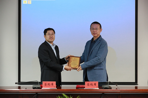 蒋传海副校长为武飞校友颁发捐赠证书,并向武飞校友赠送“历代校徽礼盒”纪念品。
