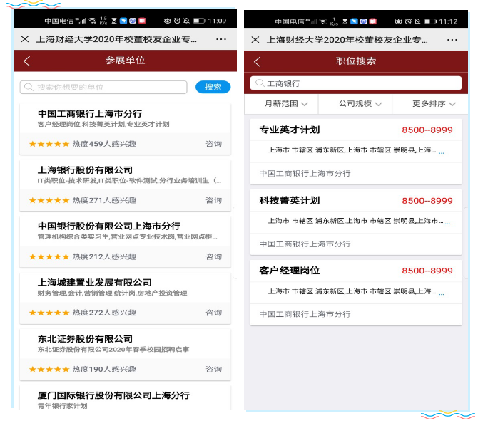 2020年4月7日,上海财经大学2020年校董校友企业专场空中双选会顺利举行。本场空中双选会由学生就业指导中心携手合作发展处联合举办,共吸引52家校董校友企业参会,提供岗位117个,招聘需求多达1691人。本场招聘会参会单位所属行业与我校学科特色高度契合,岗位涵盖面广,截至4月8日,参会学生人数近500人。