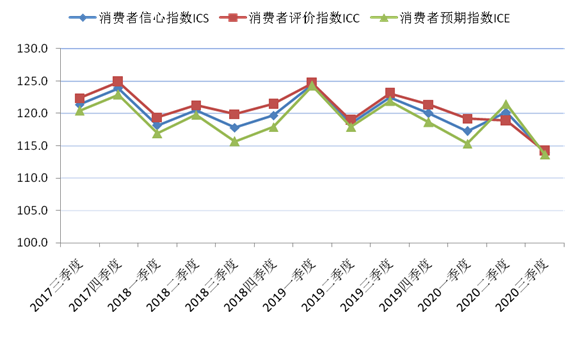 根据上海财经大学应用统计研究中心和上海社会调查研究中心上财分中心最新调查结果显示,2020年第三季度上海财经大学上海市消费者信心指数为113.9点,环比下降6.2点,同比下降8.6点。其中,消费者评价指数为114.2点,较上季度降低4.7点,同比下调8.9点。消费者预期指数为113.6点,环比和同比分别减少了7.8和8.2点,具体数据见图6。本季度各项主要指标呈现整体下调,三项主要指数处于较低点位,但仍远高于中性值,处于乐观区域。这主要是因为当前的经济形势依然面临着来自国内外的严峻挑战,国内经济增长进放缓,同时存在着影响经济发展的一系列隐患,使得消费者对经济发展的信心有所回落。