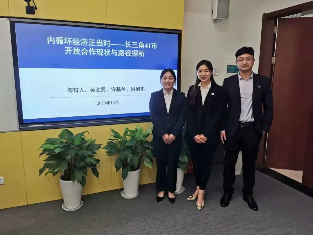 此次知行杯大赛,我们课题组紧扣国内大循环新背景,依托长三角一体化发展国家战略,将理论与实践充分融合,为长三角41市开放合作求思路、谋方法、想对策。预赛、决赛一路走来,我们收获满满。一方面,通过参与本次课题实践,我们的个人能力得到巨大提升,社会阅历得到极大丰富,另一方面,此次实践活动坚定了我们的信念,学术研究不应是空中楼阁,我们的探索应该经得起现实的考验,我们要一如既往,将理论知识内化于思,外化于行,将青春挥洒在祖国的建设中,将论文写在祖国的大地上。