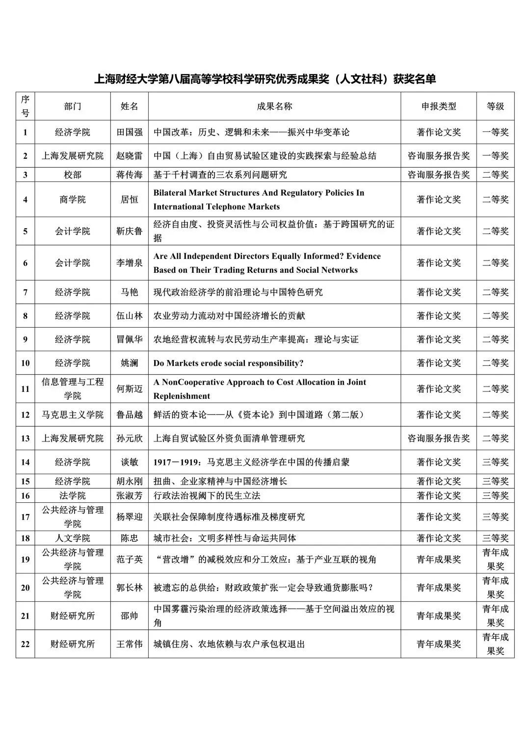 近日,教育部正式公布了第八届高等学校科学研究优秀成果奖(人文社会科学)的评选结果。我校有22项成果获奖,获奖率达到33.85%,获奖总数位列全国第十四位。其中,一等奖2项、二等奖11项、三等奖5项,青年成果奖4项。这标志着我校在教育部人文社科奖上取得重大突破,在此谨向获奖教师及其所在学科和学院表示热烈祝贺!