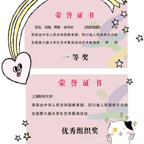 由中华人民共和国教育部和四川省人民政府共同主办的全国第六届大学生艺术展演活动于2021年5月7日在四川成都拉开帷幕。展演活动以“奋斗·创新·奉献”为主题,是教育系统为中国共产党建党100周年献礼的一项重要活动,共有31个省(区、市)、新疆生产建设兵团和香港特别行政区、澳门特别行政区的198所高校、264支代表队、6800余名师生参加现场展演。上海财经大学学生民乐团以优异的成绩代表上海市高校参加全国大学生艺术展演,并从全国数十支团队中脱颖而出,勇夺全国第六届大学生艺术展演器乐组一等奖。这是上财民乐团自第二届大艺展参赛以来,连续第五届蝉联这一全国校园艺术领域含金量最高的重量级奖项,充分彰显了我校美育教育的丰硕成果。同时我校还荣获全国第六届大艺展优秀组织奖。