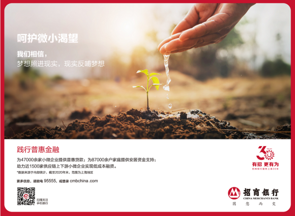 呵护微小渴望,让梦想照进现实,扶持小微企业是招行上海分行多年一贯的原则。早在2012年,分行就明确实施小企业、小微企业“两小”战略,相继成立普惠金融服务中心和小微企业贷款直营中心,并在信贷额度、考核、贷款定价等政策上对小微企业予以倾斜。为进一步缓解小微企业融资难、融资贵问题,分行不断加强普惠金融产品创新,陆续推出订单贷、医采贷、创业组织担保贷、租金贷、结算流量贷、纳税贷、投联贷、知识产权质押贷等对应各种场景的融资产品。创新推出的“招园贷”通过线上预授信额度测算系统,让企业足不出户就能获得授信,目前已在百余个园区、市工商联网站上线。目前,分行已为4.7万家小微企业提供普惠贷款,2020年授信总额1000万元以下小微企业贷款增长35%,明显快于一般贷款增速。