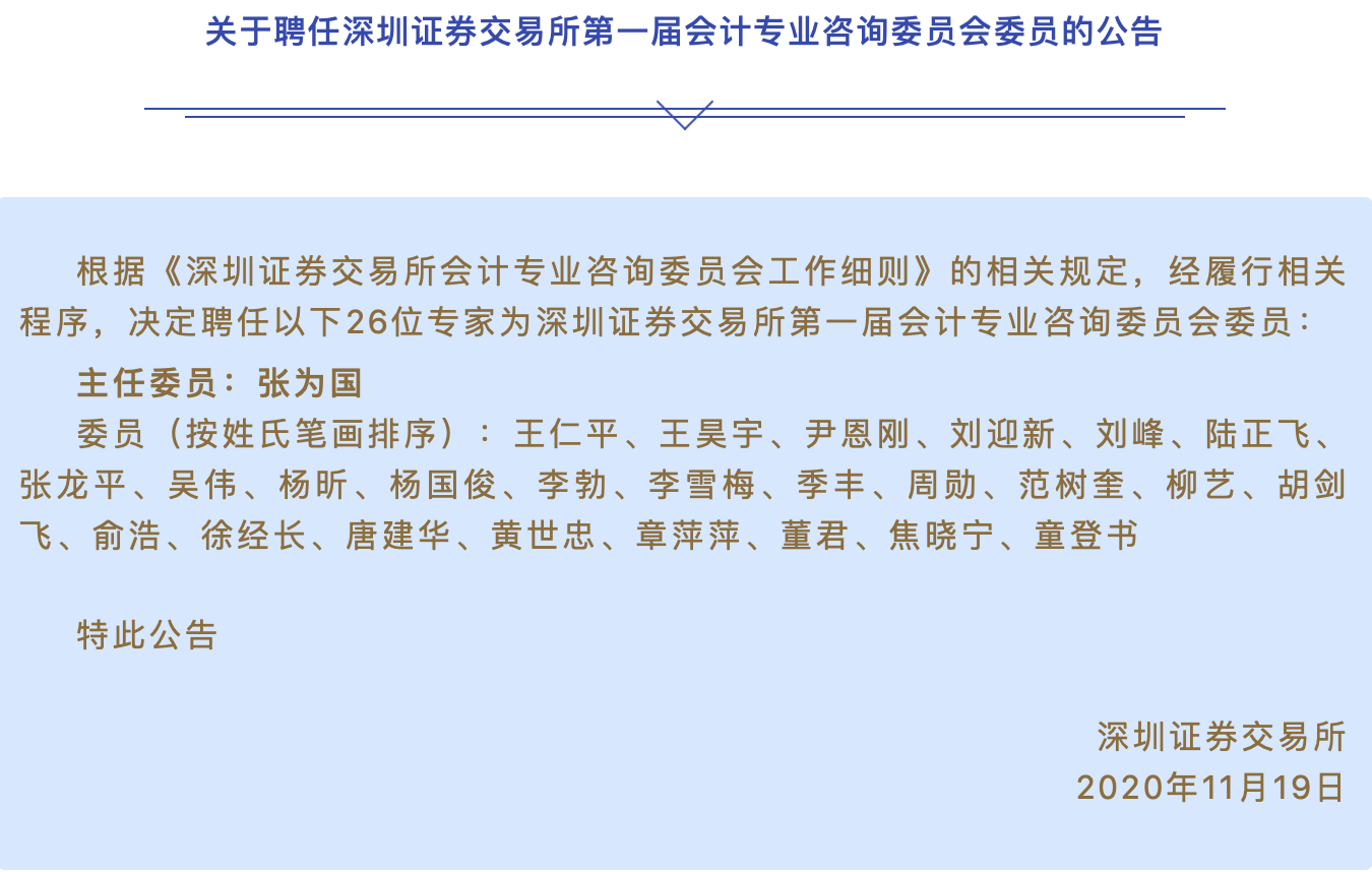 为深入贯彻党的十九届五中全会精神,认真落实国务院《关于进一步提高上市公司质量的意见》要求,日前深交所设立会计专业咨询委员会,进一步凝聚市场智慧,更好发挥各方合力,共同推动提升资本市场财务信息披露质量,为“以信息披露为核心”的注册制改革保驾护航,保障全面深化资本市场改革和先行示范区综合授权改革重点任务扎实推进。