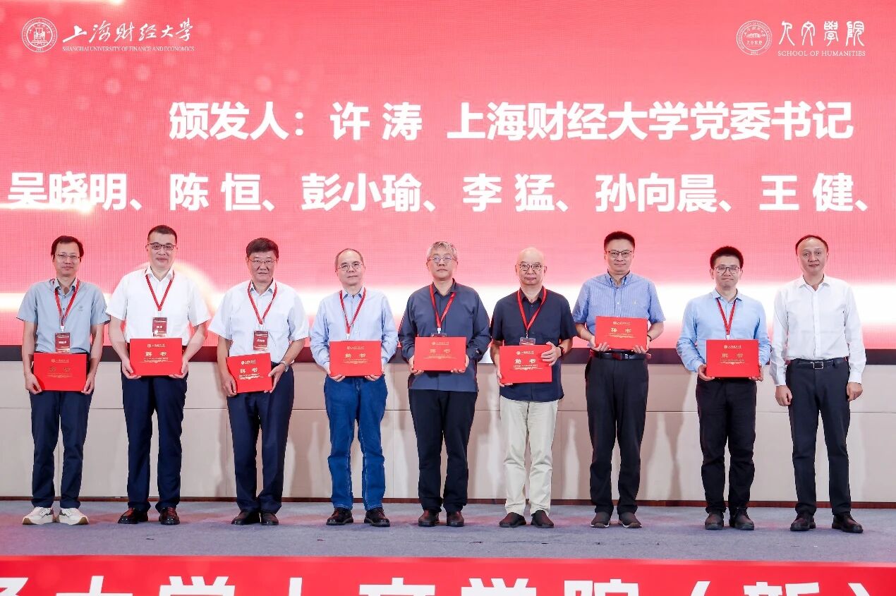 许涛书记,刘元春校长,北京大学元培学院院长李猛,复旦大学哲学学院教授孙向晨,中山大学哲学系主任张伟,武汉大学哲学学院院长李佃来,上海大学人文学院院长刘旭光,上海财经大学人文学院党委书记、院长王献华,共同为新人文学院揭牌。
