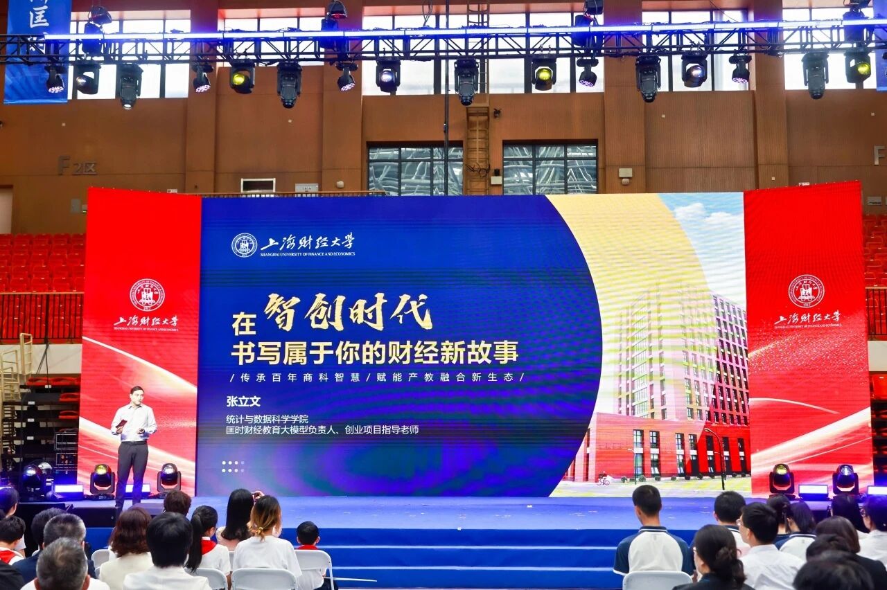 学术环节中,统计与数据科学学院柏杨教授与正在大洋彼岸继续开拓学术事业的毕业生隋阳视频连线,并与在读博士生陈思源一道生动讲述了整个课题组《学海无涯探新知》的科研成长历程,体现“导师点灯、学长引路”的温暖传承。张立文老师以《在智创时代,书写属于你的财经新故事》为题,介绍全国首个财经教育大模型“匡时”及其在“助教、助学、助研、助管”中的应用,并通过虚拟搭档“苏小菲”与新生互动,鼓励大家“做面向现实的创新者”。