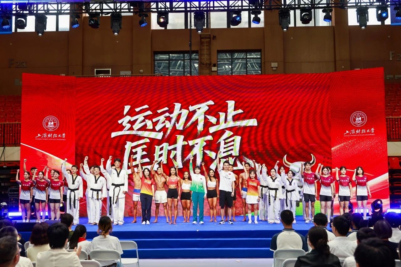 体育环节精彩纷呈,体育教学部安舒扬教练带领校跳绳队、跆拳道队、健身健美协会等展示上财体育成果。上财“运动不止,匡时不息”的体育精神不仅体现在近五年来各位学子在各级赛场上取得的139枚金牌、144枚银牌、132枚铜牌,更体现在彩绳飞舞带给现场的炫目,踢裂练功板领得观众席的惊呼,健美身躯带给新同学的青春震撼和即刻举起手机的分享冲动。
