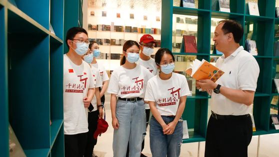 7月9下午5时许,师生一行考察了台州市黄岩区朵云书院。穿过纯白色的庭院,走进书院内部,独特的设计感和丰富的文化娱乐功能区,让上财师生眼前一亮。特别是,书院策划和推出了百年党史图片展,精选了250种、千余册红色主题图书和历史珍贵照片,献礼建党百年。在百年党史图片展区,校党委书记许涛结合自身经历,给师生讲解了十一届三中全会的召开对时代和个人发展的重要历史意义。希望上财学子将个人命运与时代发展紧密联系在一起。