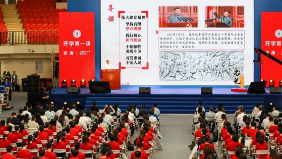 9月17日下午,上海财经大学2021级新生共同聆听书记第一堂思政课。课程主题为“坚守理想 担当使命 做新时代的奋斗者”,由上海财经大学党委书记许涛和师生代表、校外嘉宾共同讲述。课程分为“守理想 谱中国画卷”“立远志 逐青春梦想”“匡时局 续百年征程”三个篇章,以情景讲述、舞台剧、视频展现等生动形式呈现了中国共产党人和中国人民对于伟大建党精神的生动诠释。