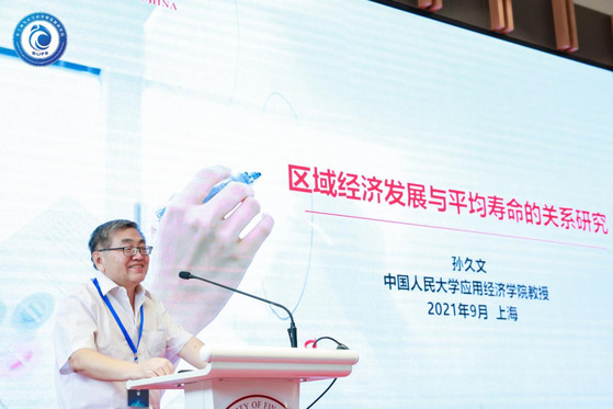 中国人民大学国家发展与战略研究院研究员、应用经济学院教授、博士生导师孙久文以“区域经济发展与人均寿命的关系研究”为题进行主旨演讲。孙教授从“十四五”时期的区域发展重大战略和区域协调发展战略出发,阐述了“十四五”规划中区域发展战略六个方面的内容:推动西部大开发形成新格局,推动东北振兴取得新突破,促进中部地区加快崛起,鼓励东部地区加快推进现代化,支持特殊类型地区发展,积极拓展海洋经济发展空间。