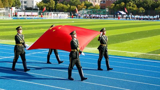 在飘扬的五星红旗下,叶一苇同学代表全体学生运动员宣誓,辛格老师代表全体教工运动员宣誓,汪琪老师代表全体裁判员进行宣誓,表达了赛出成绩,赛出成绩,赛出风格的决心。