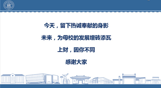 感谢老师们的耐心指导,同时我也深深感受到了任何一场大型活动的成功举办都离不开每一个人的全心付出。本次校董会的顺利举办正值104周年校庆之际,我的荣誉感与自豪感也油然而生,愿上财的未来日新月异,越来越好!