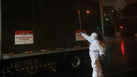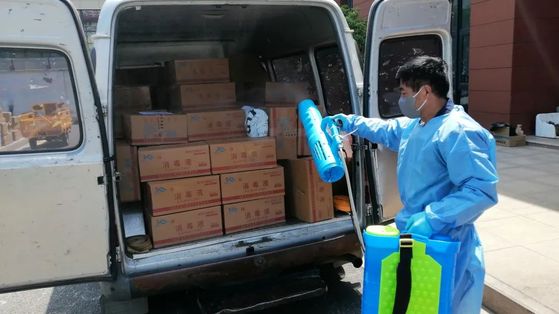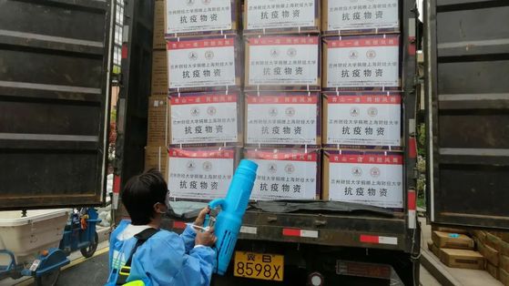 对来校的车辆和物资要多轮消杀,首先对来校的车辆轮廓做整体消杀,物资运送到校内储备仓库门口时,打开车门对货物进行二次消杀,物资卸下后在仓库门口再次消杀,为确保安全,入库后还将对物资进行一次全面消杀。