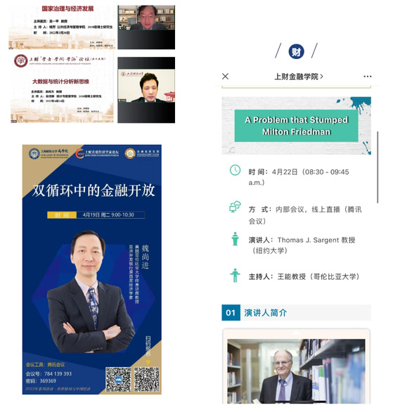 会计学院、金融学院、商学院、法学院、信息管理与工程学院等围绕经济社会热点问题,分别邀请了诺贝尔经济学奖获得者、纽约大学Thomas J. Sargent 教授,亚洲开发银行原首席经济学家魏尚进教授等中外著名学者在网络会议平台面向全校师生展开演讲,获得广泛好评。