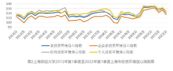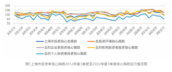根据上海社会调查研究中心上财分中心和上海财经大学应用统计研究中心对上海市企业领导人或企业家、机构投资者和个人投资者的调查结果显示,2022年第一季度上海财经大学上海市投资者信心指数为109.46点,环比下降11.15点,同比下降9.08点。指数下降,表明投资者信心较前期有所减弱,但指数值仍在中性值100点以上,处于乐观区域。