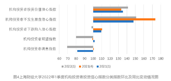 根据上海社会调查研究中心上财分中心和上海财经大学应用统计研究中心的调查,2022年第一季度上海市机构投资者信心指数为106.94点,环比大幅下降15.27点,同比下降6.98点。