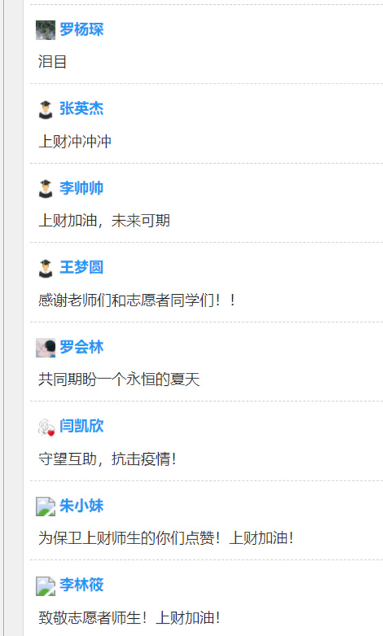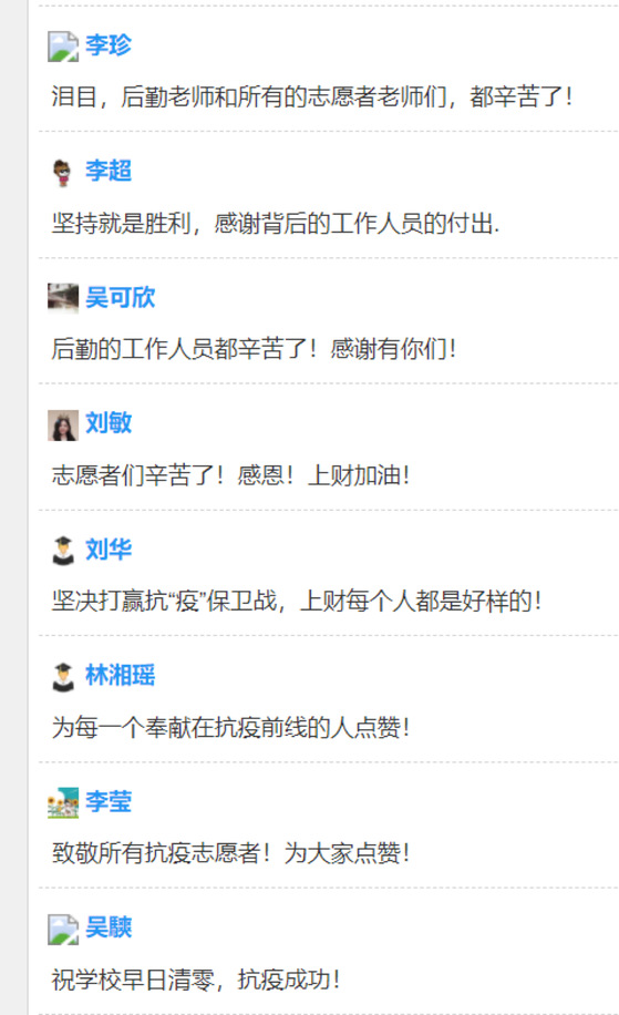 王津开:新时代呼唤新作为,新征程催生新担当。新时代的上财青年用脚步丈量祖国大地,用眼睛发现中国精神,用耳朵倾听人民呼声,用内心感应时代脉搏。突如其来的校园新冠疫情防控阻击战,既是一场没有硝烟的战争,又是一堂生动的党课活教材。疫情的多点爆发和不断攀升的感染人数让我们倍感压力,但是革命队伍从来都是不惧困难,迎难而上。上财师生历练着自己,也守护着上财,为春日里抗击疫情的上财增添了一篇温暖与安心。