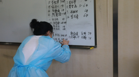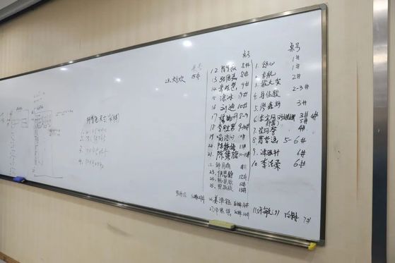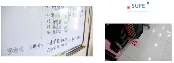 在实践中大家也会根据工作经验和实际情况优化方案。在白板上用台账记录的做法来自于突击队中的吴珊老师。吴老师不仅利用台账记录和管理设备,而且将台账应用于物资分发,进出数目所需所领,小到一瓶洗发水无不详细列出,每天更新上报。这一做法应用到行李寄存室,也使得存储信息清晰明了。一开始地面的标签是白纸黑字的,但在实际操作中李庆广老师发现因为地砖是白色,所以白底黑字不够醒目,于是调整成红纸黑字,使得信息更加突出,提高了检索辨识效率。