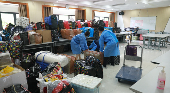 顾不上时间已经是凌晨,由常务副院长黄海量教授领衔的突击队成员们在工作群内集思广益,构建一个迷你版京东亚洲一号无人仓的想法逐渐清晰起来。第二天团队成员们个展所长,马上动手对各项数据进行测量。行李的尺寸、桌子的尺寸和数量、空间的容积,在经过采样、模型估算和反复对比之后,大家确定了纵向排列的布局方案。该方案是把桌子纵向排列,行李在桌子的上下摆放,地面添加标签用于检索;上部最高两层,方便取用;中间留下过道,供推车进出;同时加入台账式信息图,数量位置一目了然。布局方案实施后寄存容量从原先的40人份扩大到了90多人份,成功实现容量升级,同时推车自由进出,便捷性丝毫未减。