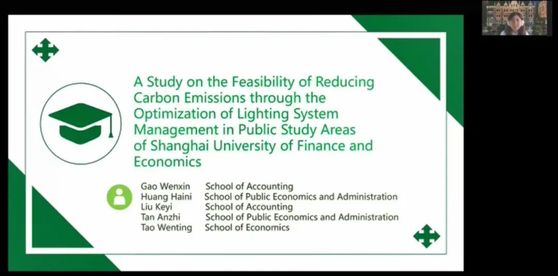 本次论坛面向2021级修读学术英语课程的千余名学生开展,共收到来自任课教师推荐的49个小组的研究计划,经过初审和匿名评审,最终选拔出12组优秀团队参加论坛的陈述展示。各展示小组选题多样,角度新颖独特,有的关注互联网新经济形态对助力环境质量改善的帮助,比如蚂蚁森林、智慧购物、绿色金融;有的关注上海市的植物景观规划、雨水排放系统在减少碳排放上的潜力;有的聚焦上财校园,通过调研楼宇设计、教室照明管理、电梯使用情况等探索上财在建设“绿色校园”之路上的可能性。这些研究视角反映了我校学生对公共议题的关注和思考,而他们的具体研究成果也呈现了经过一年的学术英语课程训练所获得的学术素养:优秀小组均体验了“选题、文献综述、研究目标、研究问题设计、研究结果、分析、结论”这一完整的课题研究过程。