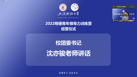 5月29日下午14:30,上海财经大学2022“明德”青年领导力训练营结营仪式于腾讯会议平台顺利举行。在结营仪式上,主持人带领营员们回顾了本届明德青年领导力训练营项目概况,并公示了优秀营员名单。在校团委、我校校董校友武飞先生的鼎力支持和社会各界的共同关照下,本期训练营完美收官。