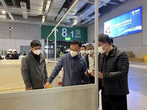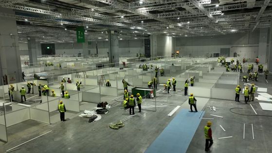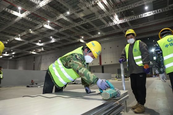 伴随着一阵阵机器轰鸣,一辆辆运输车驶入,戴着白、黄、红各色安全帽的工人们往返穿梭,施工现场一派繁忙。4个场馆,14000个床位……本市规模最大方舱医院的首个项目即将投入使用。