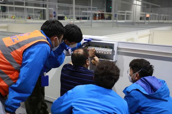 深夜里,指挥部灯火通明,连夜进行图纸会审、优化方案,各业务口负责人汇报当日工作进展及下一步工作安排,商讨问题解决对策,为抢建隔离方舱制定最优方案。管理人员每天马不停蹄现场勘查、多方协调资源、督促工作落实到位,开工首日4个场馆的每个施工点便已展开大面积施工,一项项工作紧锣密鼓展开。室内隔离方舱安装、室外成品卫生间搭建……多线并进的建设方案效果凸显。
