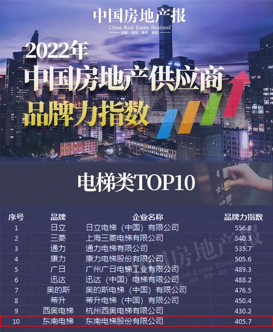 2022中国房地产供应商品牌力指数重磅发布!我校校董单位东南电梯入围电梯类品牌力TOP10