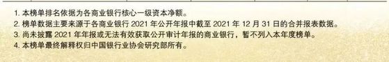 榜单遵循简单、客观、专业的原则,参考巴塞尔协议Ⅲ和监管机构相关要求,按核心一级资本净额排序,并对中国银行业前100家银行的经营规模、盈利能力、运营效率及资产质量进行综合展示。榜单数据主要来源于各商业银行公开年报,同时覆盖所有类型中资商业银行。2021年,上榜银行资产总和占商业银行总资产的89.67%,创造了商业银行96.84%的净利润,包括6家大型银行,12家股份制银行,60家城商行、21家农商行和1家民营银行。